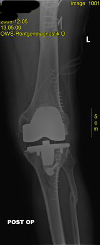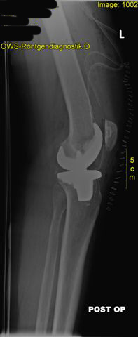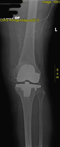 postoperatives Röntgen mit korrektem Sitz der Knieprothese