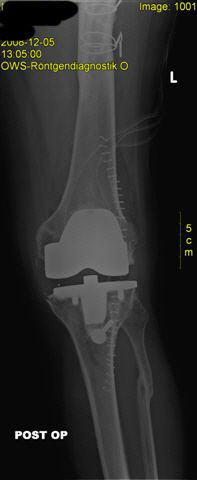 postoperativer Zustand mit liegender zementierter Knieprothese und gerade gestellter Beinachse